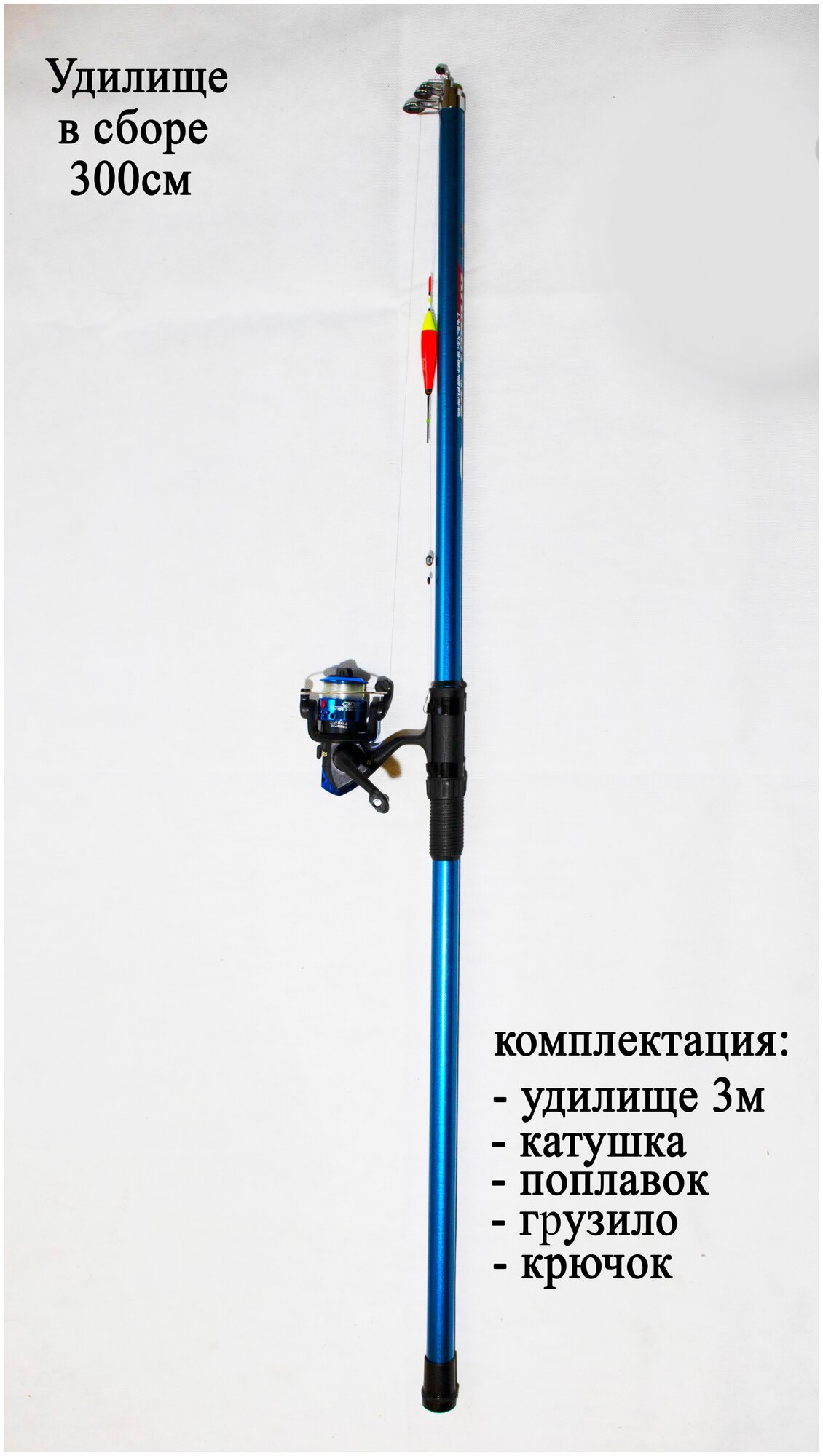 Готовый оснащенный набор для рыбалки. В комплект входит удилище 3м, катушка, леска 40 метров, поплавок, грузило.
