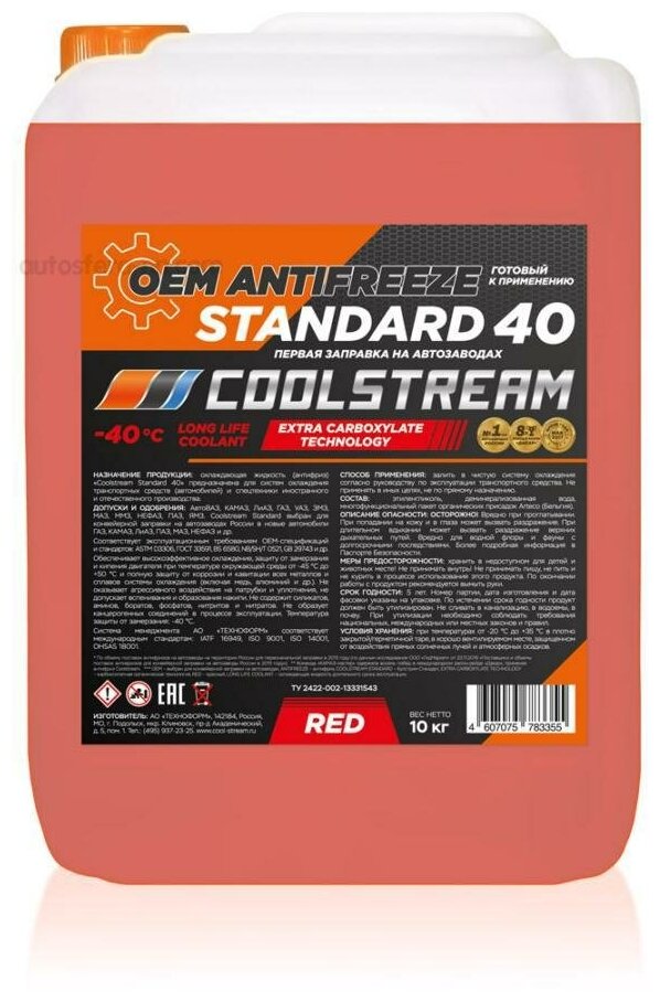 Изготавливается из водного раствора моноэтиленгликоля и многофункционального пакета моющих, антикоррозионных и смазывающих присадок. Предотвращает появление накипи и коррозии в системе охлаждения и обеспечивает нормальный тепловой режим работы двигателя. Можно использовать в качестве теплоносителя в местных системах отопления. Не содержит нитритов и аминов, имеет повышенный срок эксплуатации. Рабочий диапазон температур – от -45 °С до +115 °С.