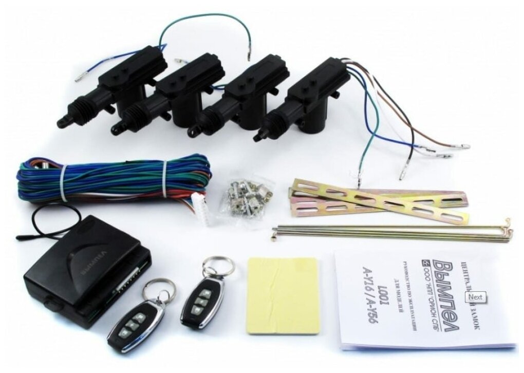Центральный замок — система централизованной блокировки замков, которая позволяет одновременно закрыть или открыть все двери автомобиля. Данная модель содержит четыре электропривода в каждую из боковых дверей. За счет универсальности этот продукт совместим с большинством автомобилей, включая те, где с завода уже стояли замки, но вышли из строя. Управление производится брелоком дистанционного управления, в комплектации их две штуки.