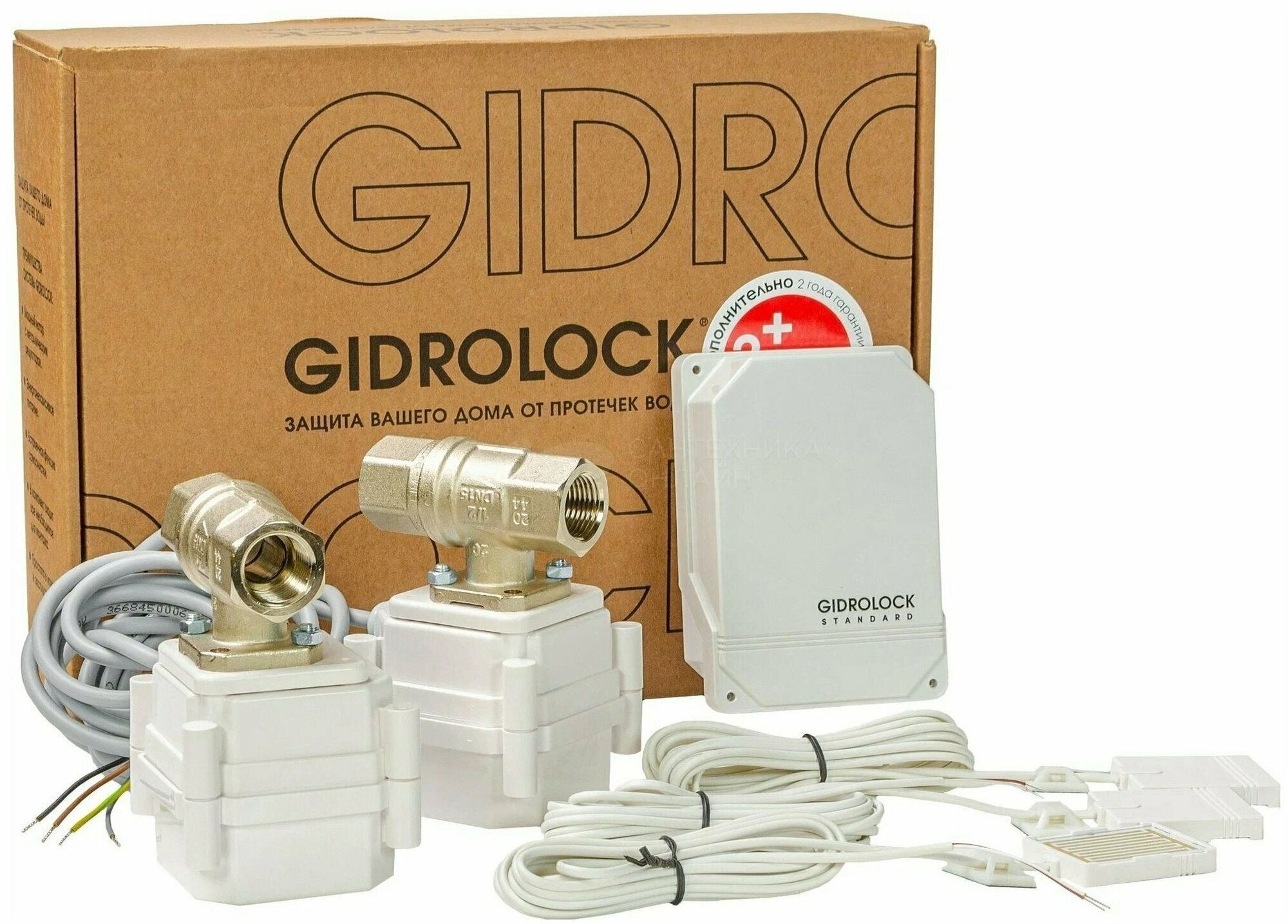 Гарантийный срок - 10 лет. Комплект Gidrolock Standard новое и доступное решение для защиты вашего дома от неприятных последствий потопа. Идеально подходит для установки в квартире или загородном доме. Принцип работы системы очень прост: при возникновении аварийной ситуации и попадании воды на электроды датчиков, происходит перекрытие водоснабжения и включается звуковой сигнал. Шаровые краны с электроприводом могут устанавливаться в системах водоснабжения и отопления.