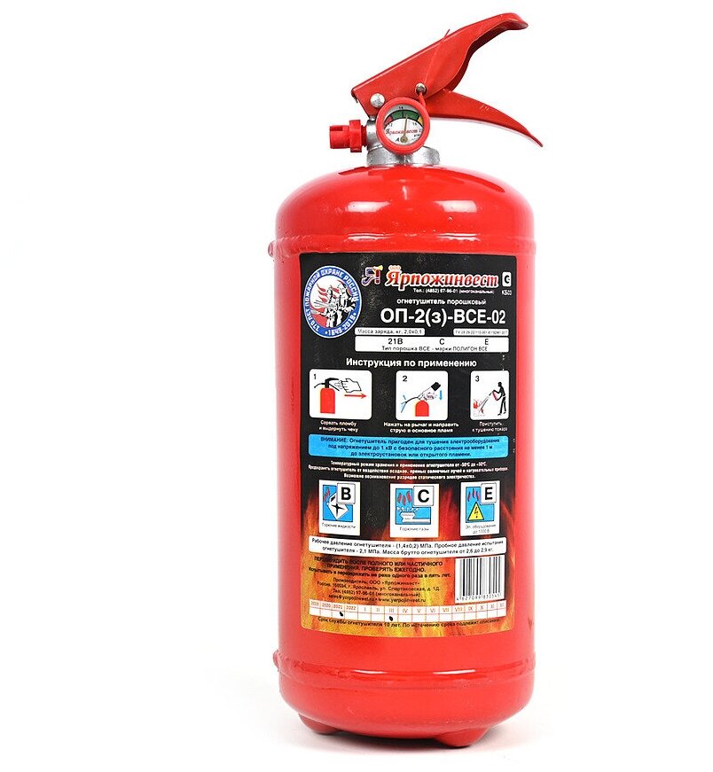 Огнетушитель Ярпожинвест ОП-4 з АВСЕ предназначен для первичного тушения пожаров и возгораний класса A, B, C, E (горючие и легковоспламеняющиеся жидкости, твердые горючие вещества и газы, электроустановки, не превышающие напряжение 1000 Вольт). Изделие подходит для оснащения различных объектов и помещений: административных зданий, жилых домов, офисов, гостиниц, промышленных участков и мн. др. Внимание, изображение товара может отличаться от реального!