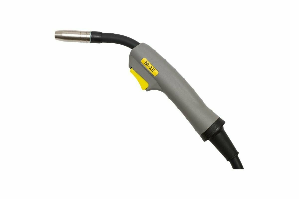 Свойства полуавтоматической горелки UNOMIG-15: Горелка MIG-15 предназначена для аппаратов полуавтоматической сварки c центральным евроразъемом. Горелка имеет воздушное охлаждение. На ручке горелки установлен курок, который запускает или останавливает процесс сварки. В конструкции есть шарнир, который значительно уменьшает нагрузку на кисть руки и делает процесс сварки более удобным. Длина горелки составляет 5 метров. Горелка имеет высокостойкое к истиранию покрытие.