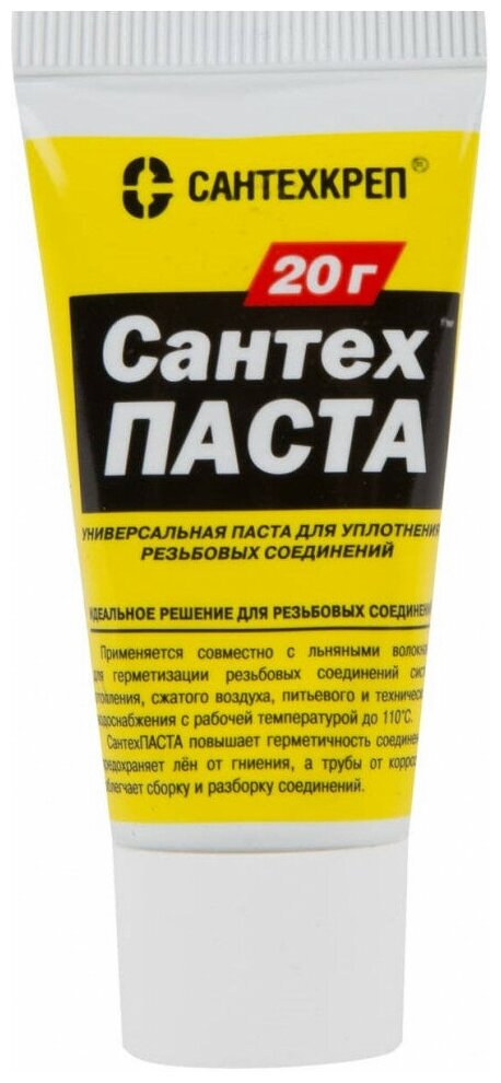 Паста Сантехпаста — это универсальный уплотнительный состав для герметизации резьбовых соединений в системах отопления, бытового и питьевого водоснабжения. Используется с льняными волокнами. Разрешена эксплуатация для систем с рабочим давлением до 8 атм и температурой до 140°С. Преимущества: проста в использовании; широкая сфера применения; сохраняет изначальные свойства даже после заморозки.