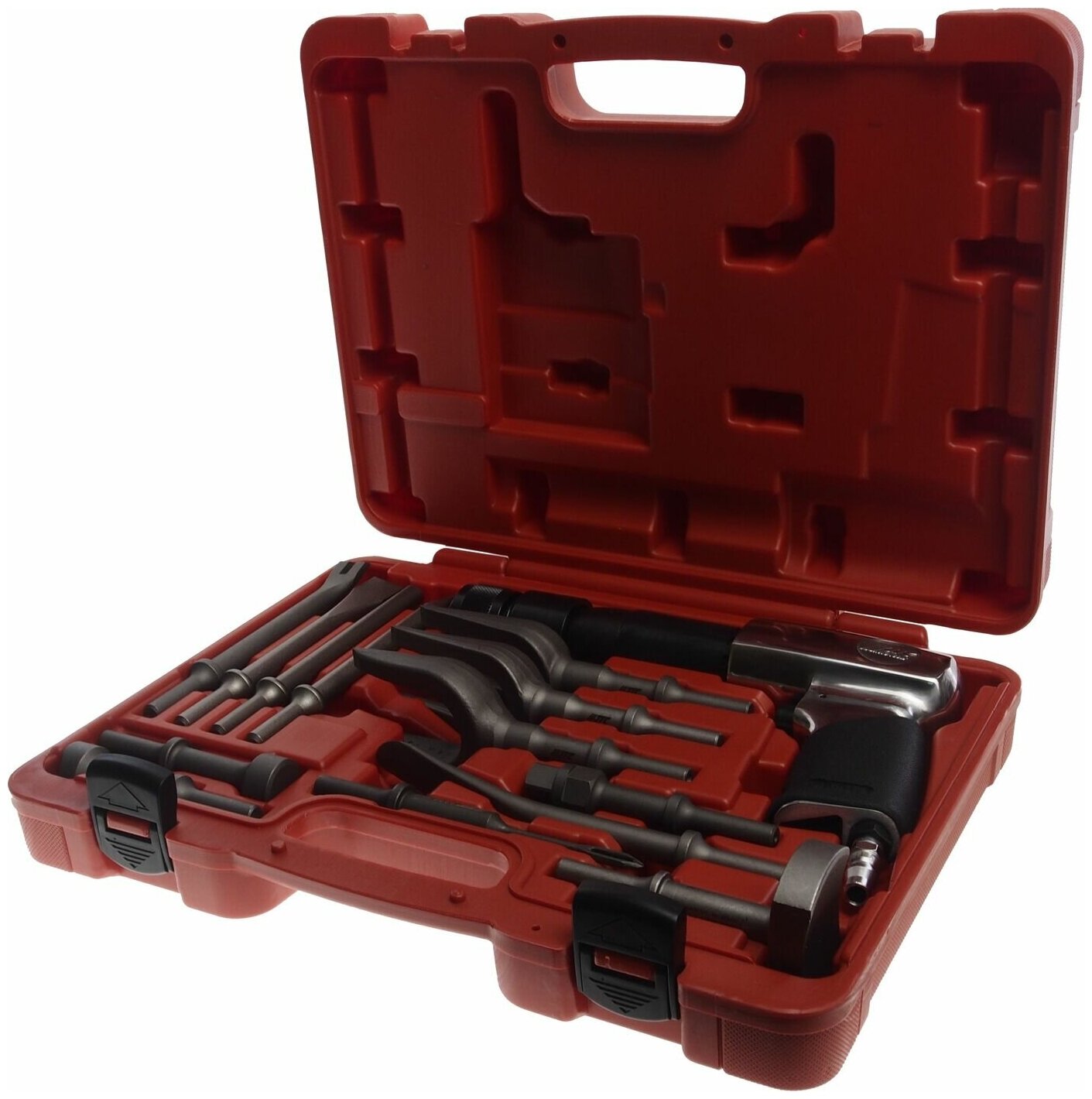 Описание Молоток пневматический 190 мм в наборе с насадками, 9 пр. Область применения Молоток пневматический THORVIK применяется для резки, рубки, разрушения материалов различной твердости и пластичности в зависимости от используемой насадки в мастерских и цехах, оборудованных воздушной магистралью с давлением воздуха не ниже 6 атм. или компрессором, такой же мощности персоналом, имеющим соответствующую квалификацию, знакомым с правилами техники безопасности, условиями эксплуатации и навыками работы с