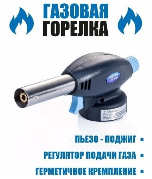 Портативная газовая горелка на цанговый газовый баллон. Мобильное и лёгкое приспособление, позволяющее получить чётко направленное пламя, имеющее факельную структуру. Пламя, получаемое с помощью такой горелки, может достигать температуры 1300 °C. Пьезоподжиг дает возможность пользоваться горелкой без использования зажигалки. 1. Автоматическое зажигание, простая и безопасная работа. 2. свободно регулировать размер пламени 3. 360° свободный поворот. 4. Многоразовый кассетный газовый бак. 5.