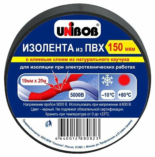 Лента поливинилхлоридная электроизоляционная с липким слоем товарного знака предназначена для изоляции проводов и кабелей, работающих в статическом состоянии при напряжении до 600В, при ремонте и сращивании электрокабелей с неметаллическими оболочками. Предназначена для проведения электротехнических и авторемонтных работ, а также соединения и изоляции труб. Состав: ПВХ-плёнка, клеевой слой на резиновой основеТемпература эксплуатации от -5°С до +45°СПрочность при растяжении: 15.0 МПадлинение при разрыве