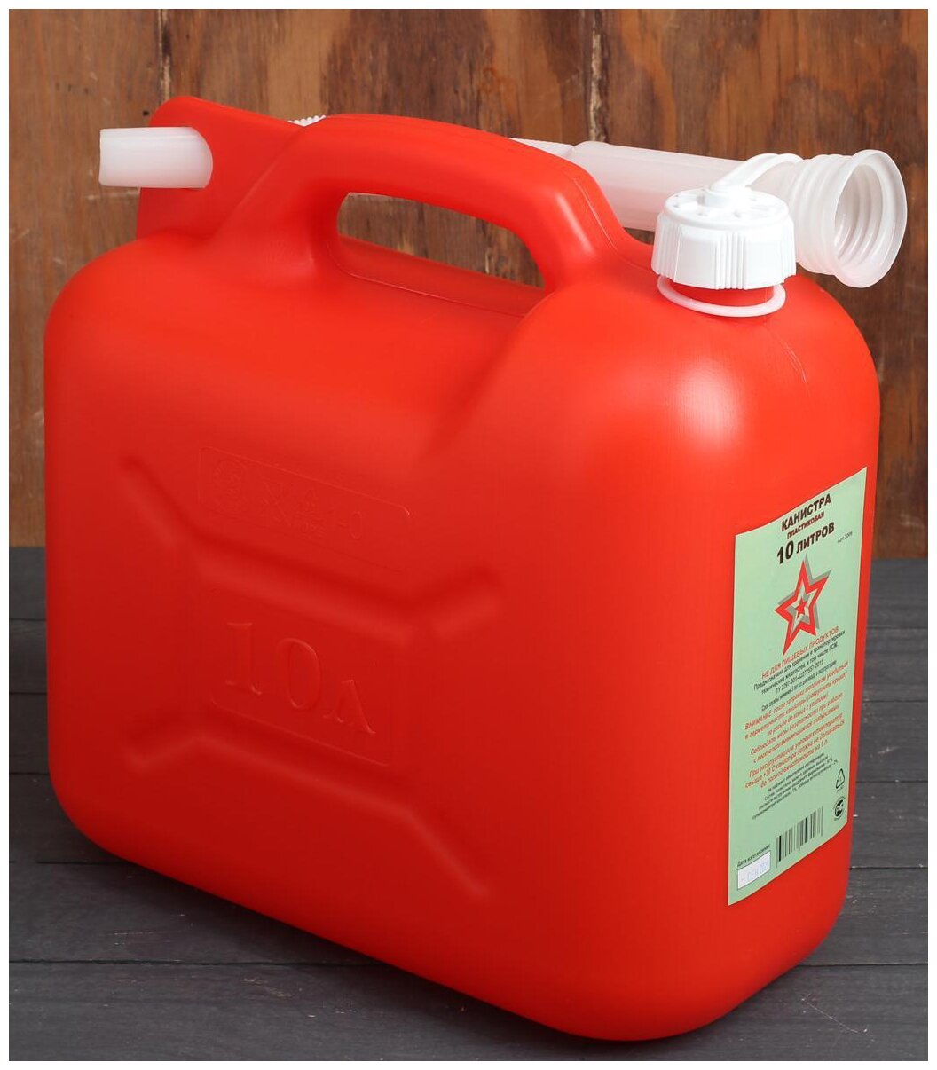 Канистра предназначена для хранения и перевозки топлива, масла, воды. Изготовлена из полимера с антистатическими добавками, что позволяет безопасно хранить топливо и разрешает осуществлять заправку на АЗС, о чём свидетельствует сертификат, указанный на этикетке. Канистра оснащена гибкой лейкой с воздухоотводом, которая убирается внутрь канистры. Стопорное кольцо предотвращает случайное откручивание крышки.