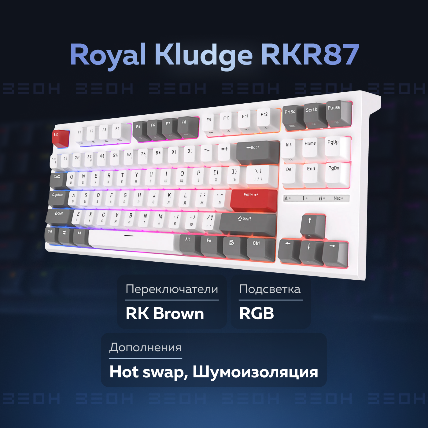 Клавиатура Royal Kludge RKR87 Клавиатура механическая Royal Kludge RKR87. 87 клавиш. Подсветка RGB. Проводная (USB type C). 14 режимов подсветки. Переключатель RK brown switch (тактильный). Технология hot swap. Шумоизоляция, смазанные переключатели, стабилизаторы. Совместима с операционными системами Win/macOs. В комплект входит руководство по эксплуатации, 4 сменных переключателя, один провод USB type C, один инструмент съемник (пуллер) для клавиш, пластиковый кожух для защиты от пыли. Корпус пластиковый.
