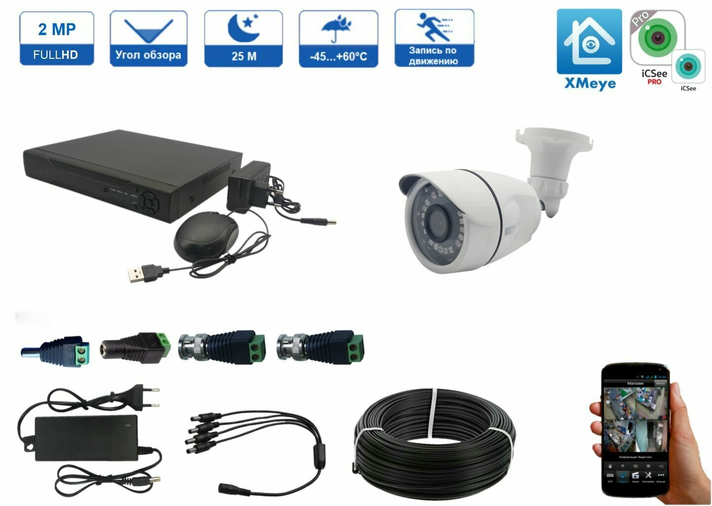 Готовый комплект видеонаблюдения для самостоятельной установки на улице и внутри помещения на 4 камеры 2 Мп, с возможностью просмотра онлайн и архива на телефоне (Android, Iphone) приложение XMEYE Простота подключения мобильных устройств к видео: необходимо просто отсканировать QR - code с помощью камеры мобильного телефона. Отличное изображение в дневное и ночное время за счет разрешения 2 Мр, 1920х1080 и ИК подсветки до 25 метров. Полноценная запись 2 Мп 1920х1080 (Full HD)