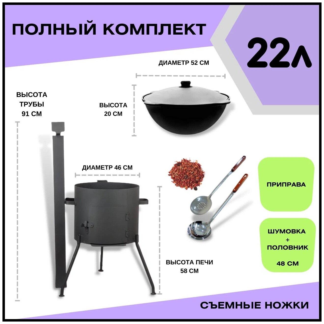 Набор «Дачный» не оставит равнодушным ни одного любителя блюд на огне. В набор входит: 1. Печь с дверцей и трубой для казана объемом 8 литров GF-Т8 — это надежное изделие из металла, которое создано специально для приготовления различных блюд в казане, которое будет незаменимо для использовании владельцами дачных участков и загородных домов на улице. Ведь для правильного приготовления пищи в казане варочная панель или плита не подходит, так как они не обеспечивают равномерное распределение тепла по всей
