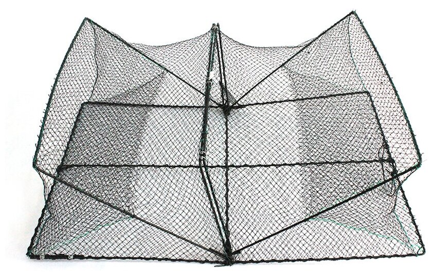 Рыболовная сетка ловушка . Полотно сшито в виде конуса с кормушкой, которую можно забрасывать в ручную, либо с помощью спиннинга. После заброса сеть рыболовная расправляется за счет раскроя и плотности материала. Подплывающая к кормушке рыба, приближаясь к прикорму, попадает в ловушку, которая находится в воде в уже распущенном состоянии. В кормушку-пружину нужно вдавить прикорм (специальную смесь для прикормки или просто пшенную, перловую кашу) и, закинув сетку ловушку, ждать поклевки.