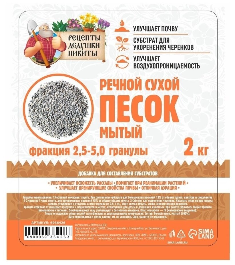 Скидка 5% на Речной Песок Рецепты Дедушки Никиты , Сухой, Фр 2,5-5,0, Гранулы, 2 Кг
